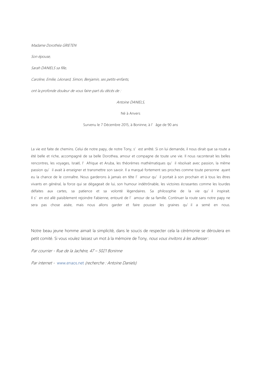 Décédé à Boninne (5021) le lundi 7 décembre 2015 à l'âge de 90 ans