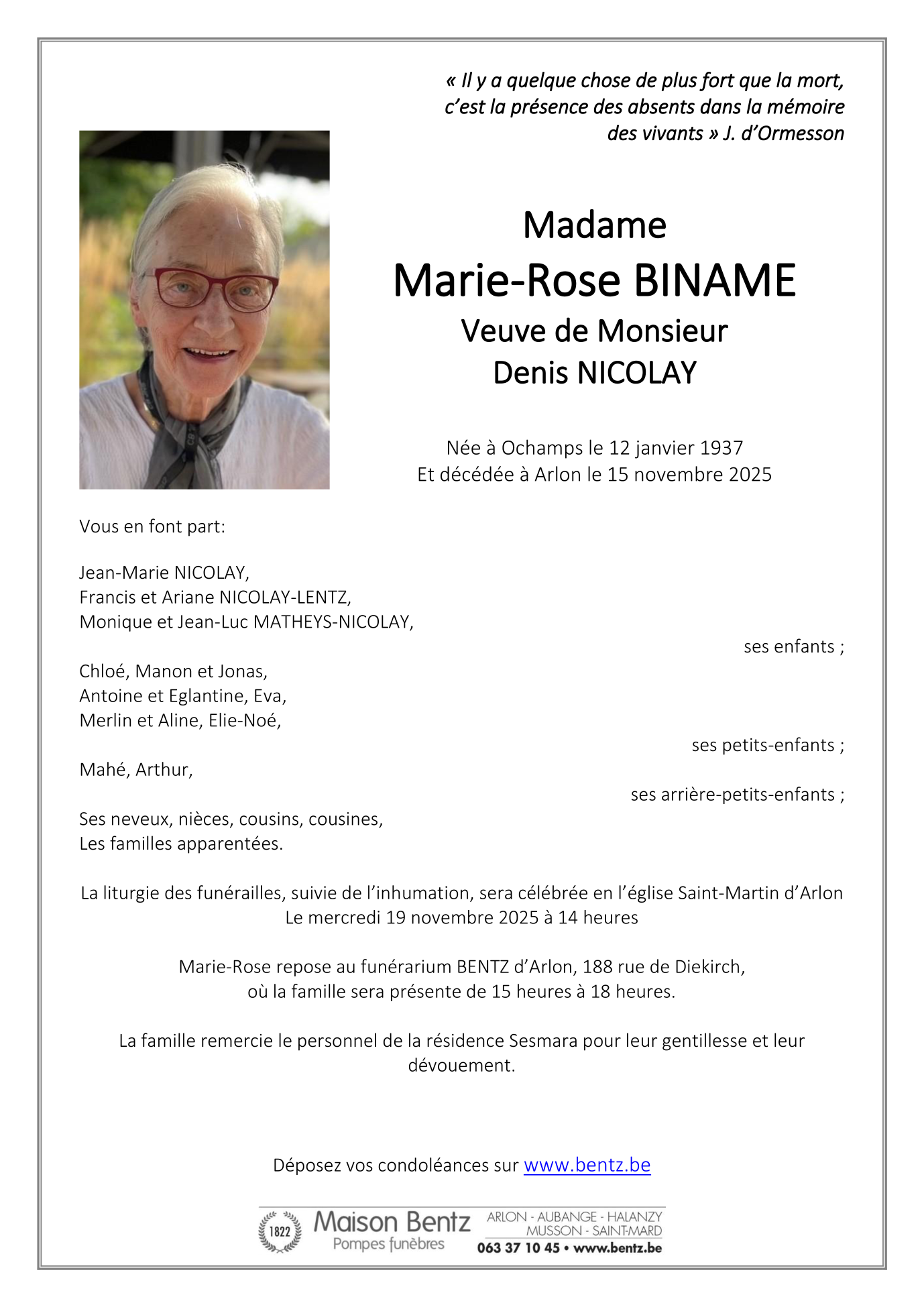 Décédée à Arlon (6700) le samedi 15 novembre 2025 à l'âge de 88 ans