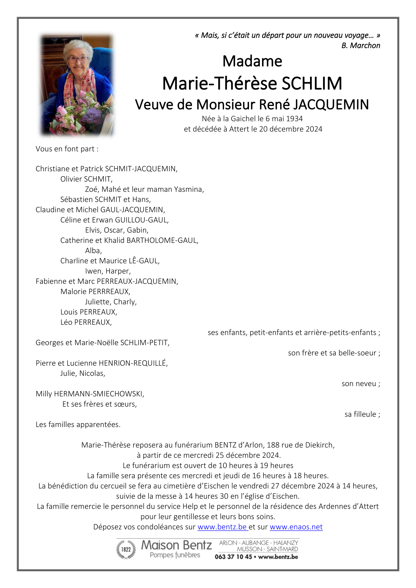 Décédée à Attert (6717) le vendredi 20 décembre 2024 à l'âge de 90 ans