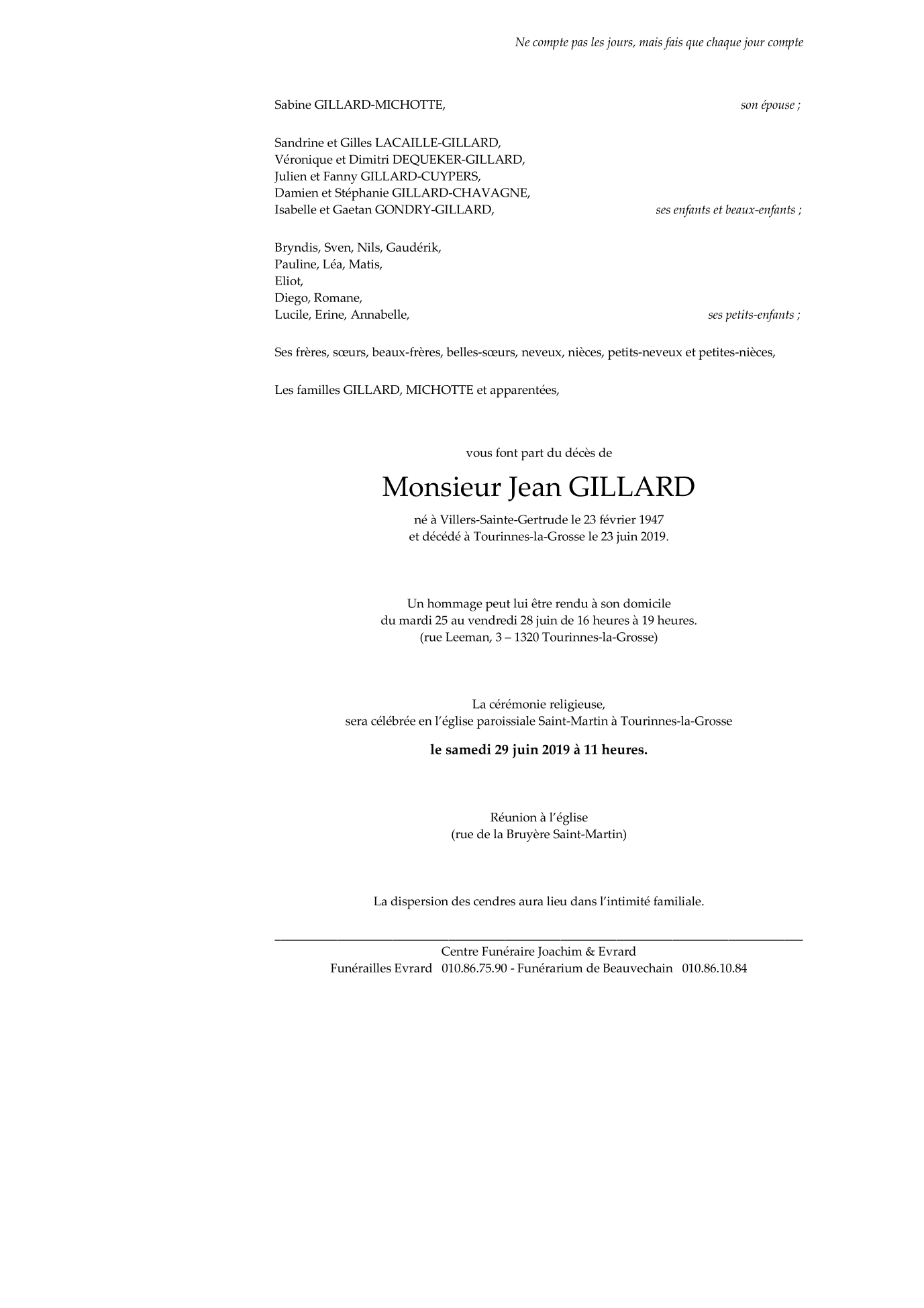 Décédé à Tourinnes-la-Grosse (1320) le dimanche 23 juin 2019 à l'âge de 72 ans