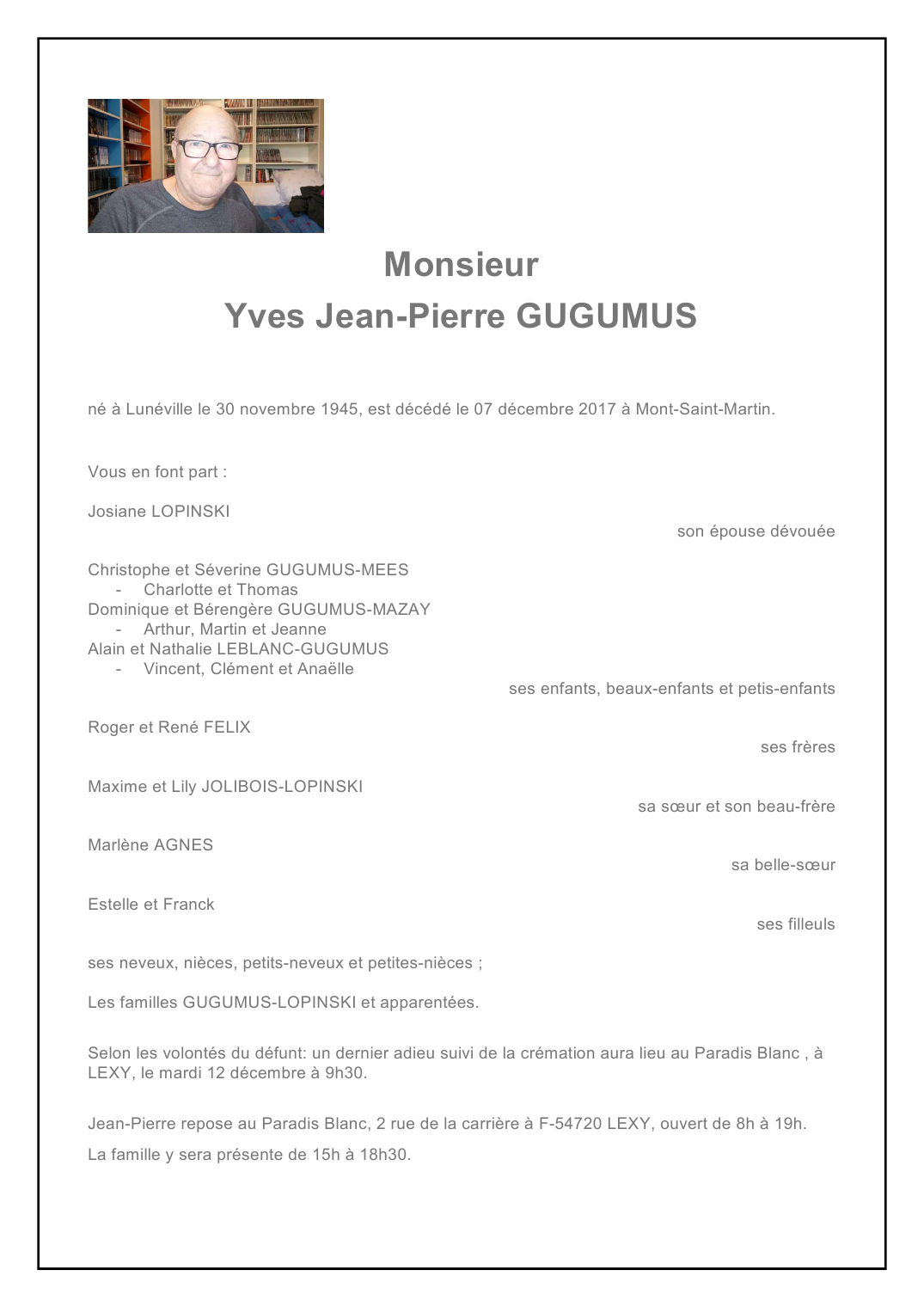 Epoux de Madame Josiane GUGUMUS née LOPINSKI