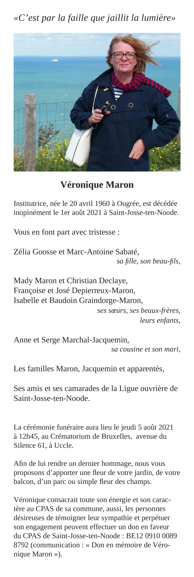 Décédée à Sint-Joost-ten-Node (1210) le dimanche 1 août 2021 à l'âge de 61 ans