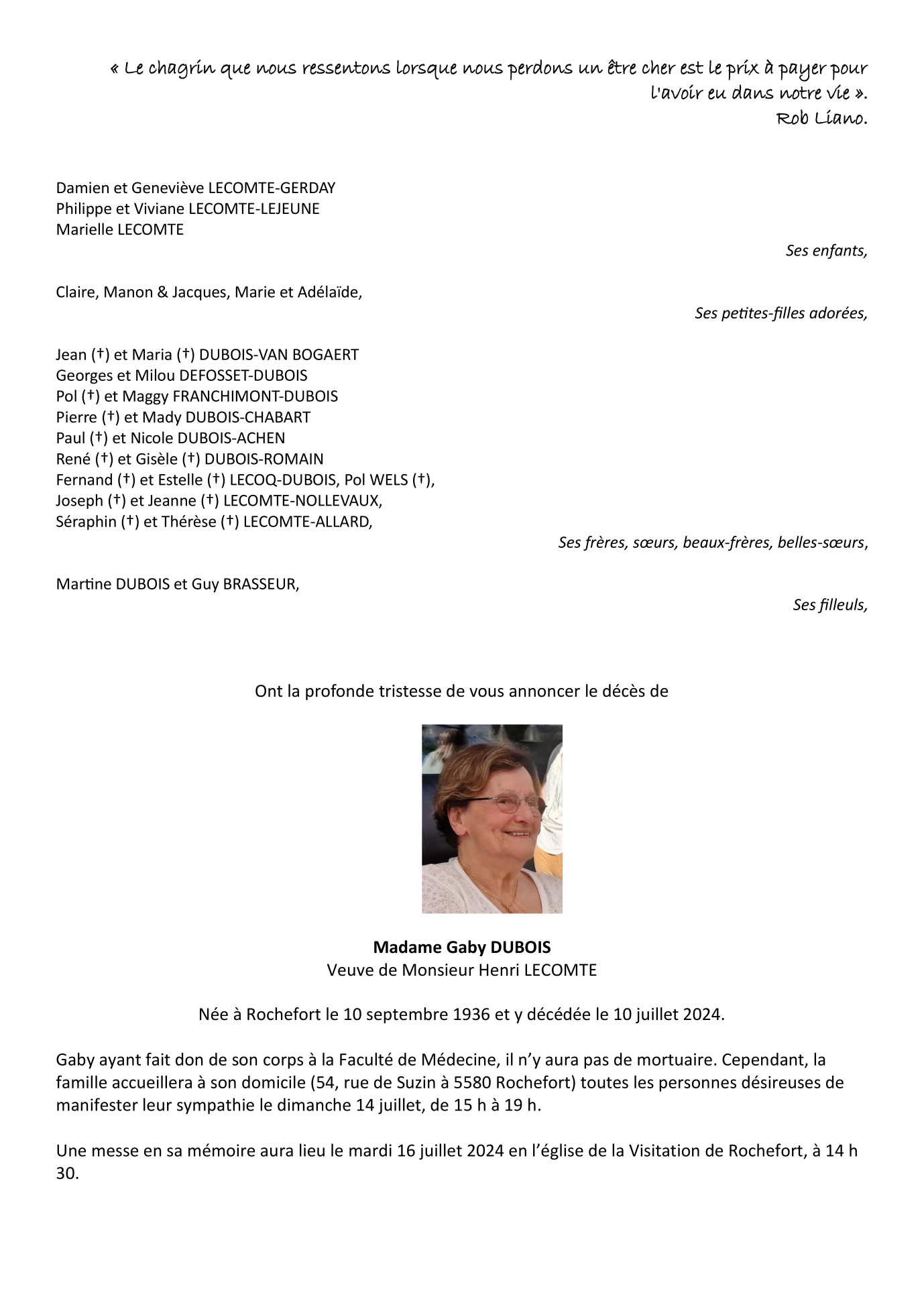 Décédée à Rochefort (5580) le mercredi 10 juillet 2024 à l'âge de 87 ans